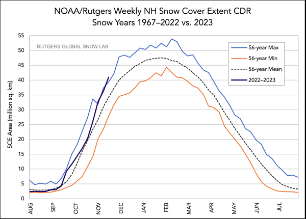 Figur 2. Den svarta kurvan visar att snötäcket nu är störst sedan 56 år