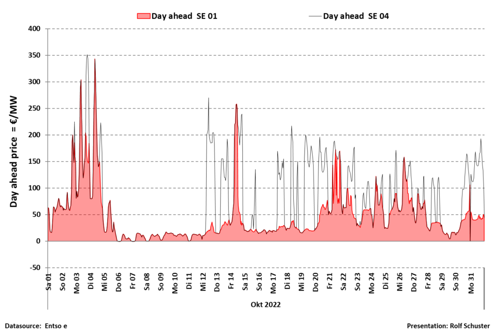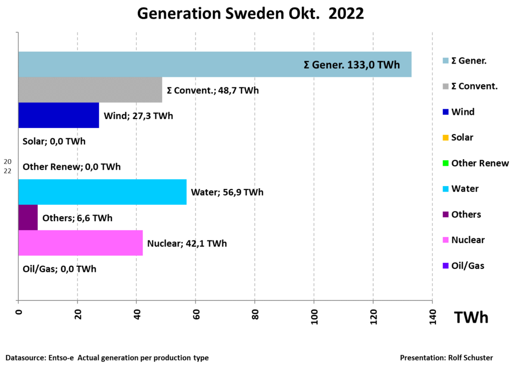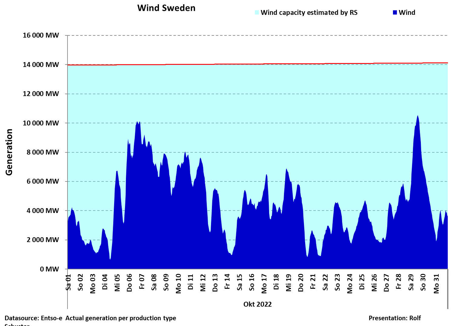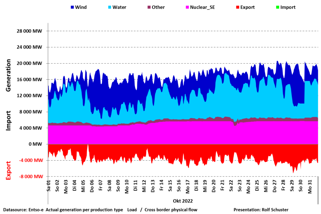 Vindkraften varierade mellan 1000 och 10000 MW under oktober. De som tycker att vindkraft är bra kan ju anpassa sin elförbrukning efter vindkraftens väderberoende till mellan 1000 och 10000 W. Med 1000 W har alla i alla fall tillgång till ljus, kylskåp och frysbox men det går nog inte att laga mat, dammsuga, använda mikron och ladda elbilen.