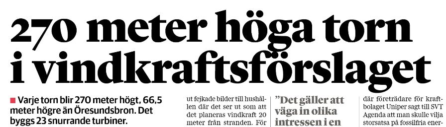 På en helsida intill tar HD/Sydsvenskan upp planerna på vindkraftverk i Öresund: