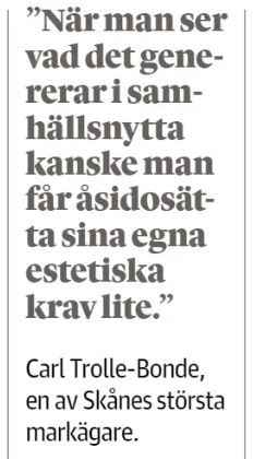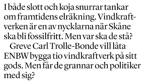 Jag hoppas verkligen att Svalövs kommun har vett nog att sätta stopp för familjen Trolle-Bondes vindkraftsplaner. Det skånska landskapet är redan kraftigt förfulat av vindkraftverk och vi behöver inte mer intermittent kraftproduktion, utan det vi behöver är reglerbar och pålitlig kraftproduktion. Samtidigt borde alla planer på havsbaserad vindkraft skrotas. Dessa ligger ofta i flyttfågelsträck och är förödande för våra flyttfåglar. Bra är dock att regeringen föreslagit att vindkraftsägarna i sådana fall själva ska stå för anslutningskostnaderna till land och inte om nu skicka notan till skattebetalarna.
