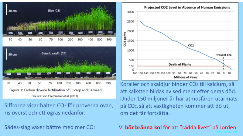 - När jag berättade att det är BRA med mer koldioxid tänkte jag på figur 2 och sade att halten var 8.000 ppm för 150 miljoner år sedan, men rätt siffra är 2.500 ppm. Det viktiga är förstås att kurvan går ner mot så låga nivåer att livet upphör, om “människan” inte “räddar livet” på planeten genom att bränna fossila bränslen.