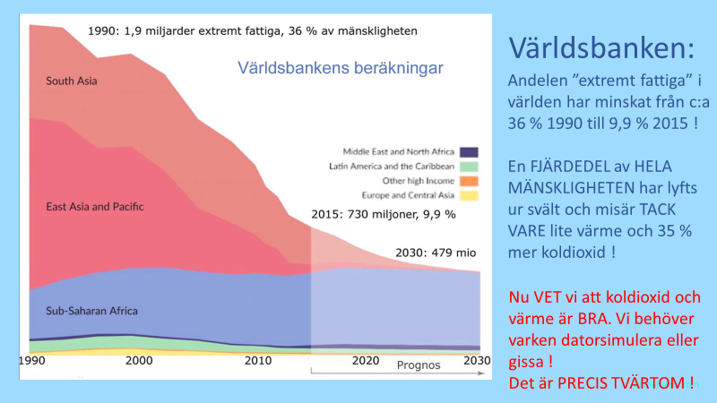 Den frodigare tillväxten med mycket större skördar sedan 60-talet kan till större delen tillskrivas den lilla uppvärmningen och den betydande ökningen av halten CO₂. Världsbanken beräknar att den andel av mänskligheten som är “extremt fattiga” minskat från 75 % 1960, till 36 % 1990 och 9,9 % 2015.