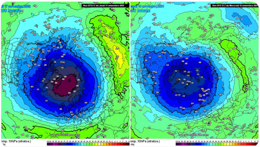 Figur 2. Den “Arktiska Bubblan” för 22-11-17 till vänster, jämförd med den för 21-11-10 till höger