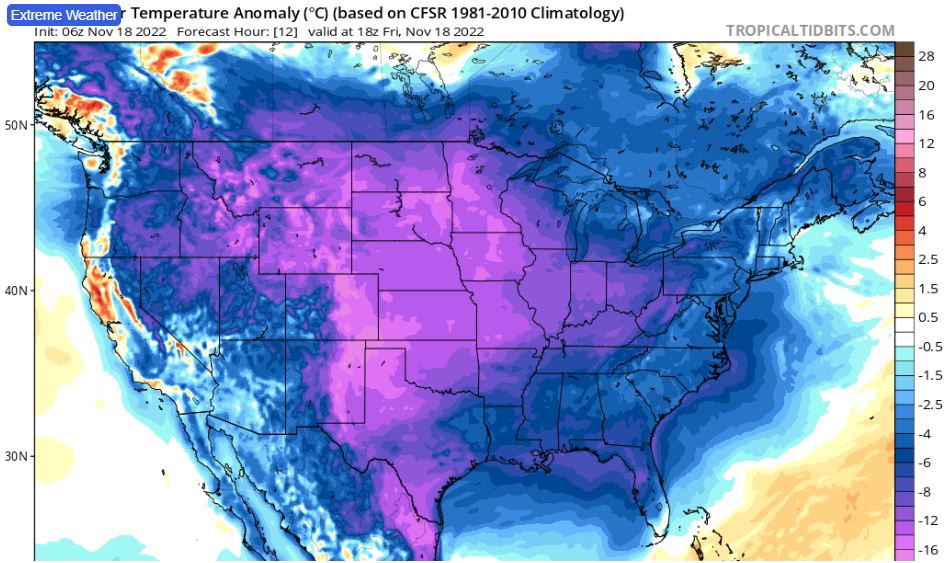 Figur 2. USA: Temperaturens anomali för fredagen den 18/11