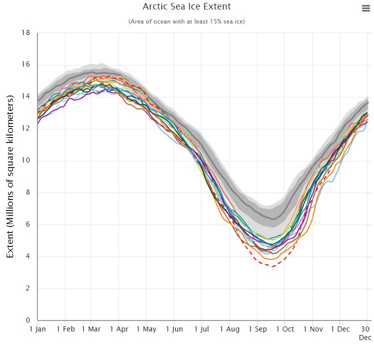2022-11-20 var utbredningen 9,895 miljoner km², vilket ligger bland de övre kurvorna. Isen ser alltså inte ut att försvinna i år heller. Den röda streckade kurvan avser 2012, då ett absolut minimum noterades efter ihållande stormar, som blåst upp höga vallar längs Kanadas kust. Notera att det årets maximum var högst för dessa år.
