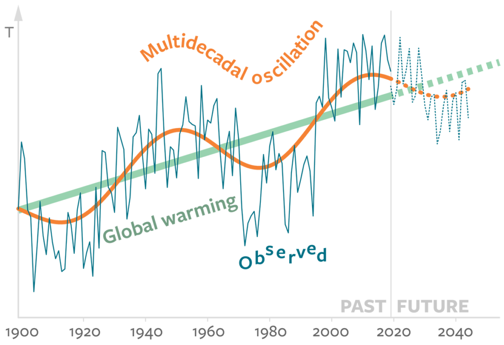 Forskarna konstaterar att den nordatlantiska multidecadala oscillationen, en viktig havs-ström som har pumpat varmare vatten in i Arktis, håller på att försvagas. Det leder till ett svalare område i norra Atlanten och lägre temperaturer, vilka noterats under perioden 1950–1970.