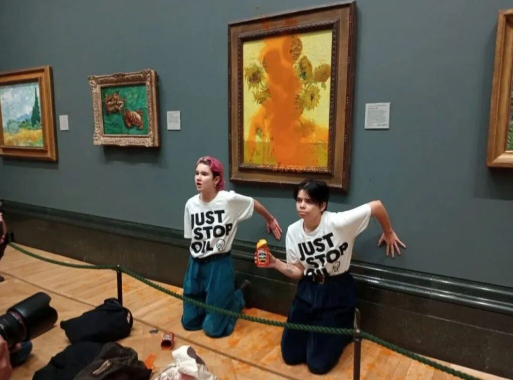 Figur 2. Två medlemmar i gruppen “Just Stop Oil”, en avläggare från XR, kastade tomatsoppa på van Gogh’s målning “Solrosor” i National Gallery, värderad till £76 miljoner, den 14/10 2022