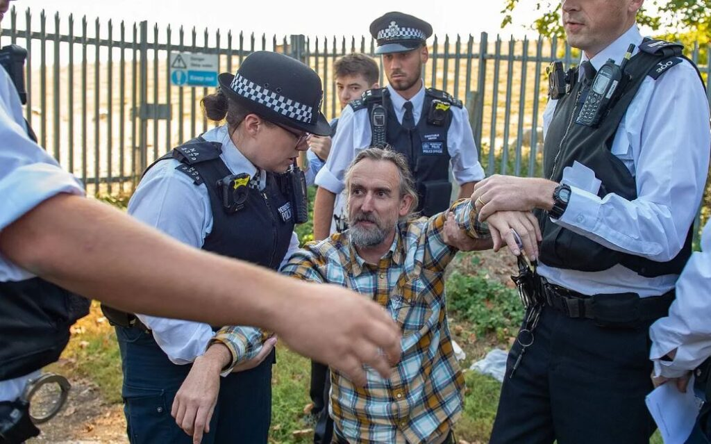 Figur 3. Roger Hallam arresteras av polisen vid en “destruktiv” demonstration