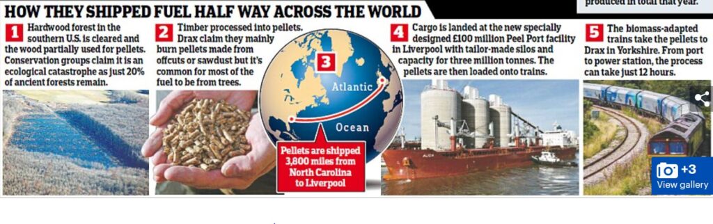 Detta för oss vidare till den djupt alarmerande processen för produktionen av detta “gröna” bränsle från skogar i North Carolina, där veden förvandlas till pellets och sedan transporteras inte mindre än 6.000 km över Atlanten till Yorkshire.