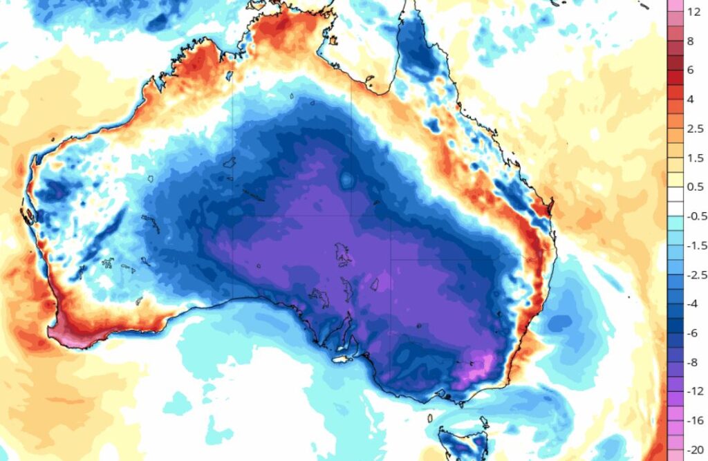 Kartan visar prognos för 2023-02-04 med avvikelser från medelvärdet 1981 - 2010. Över stora områden är temperaturen mer än 6 grader lägre än normal och på vissa områden 12 grader kallare. En kallfront sveper över de södra och östra staterna med temperaturer som faller till sina lägsta februarinivåer på årtionden, enligt uppgifter från Bureau of Meteorology (BoM).