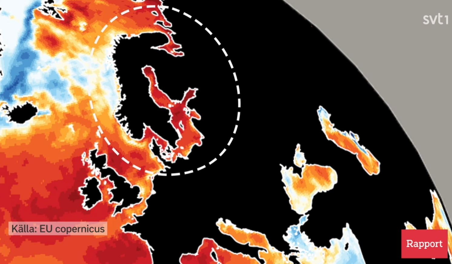 Figur 1. EU:s program Copernicus rapporterar ovanligt höga temperaturer i haven, Rapport 2023-07-07, kl 18:00