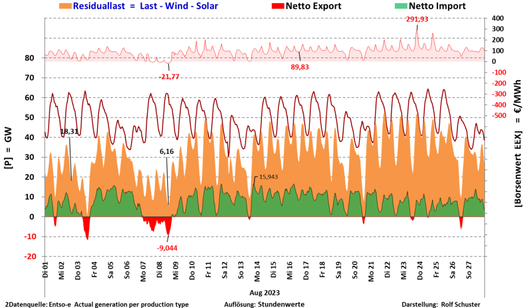 Figur 5. Residual effekt = Reglerkraft för att komplettera sol- och vindkraft samt export, import och EEX-pris