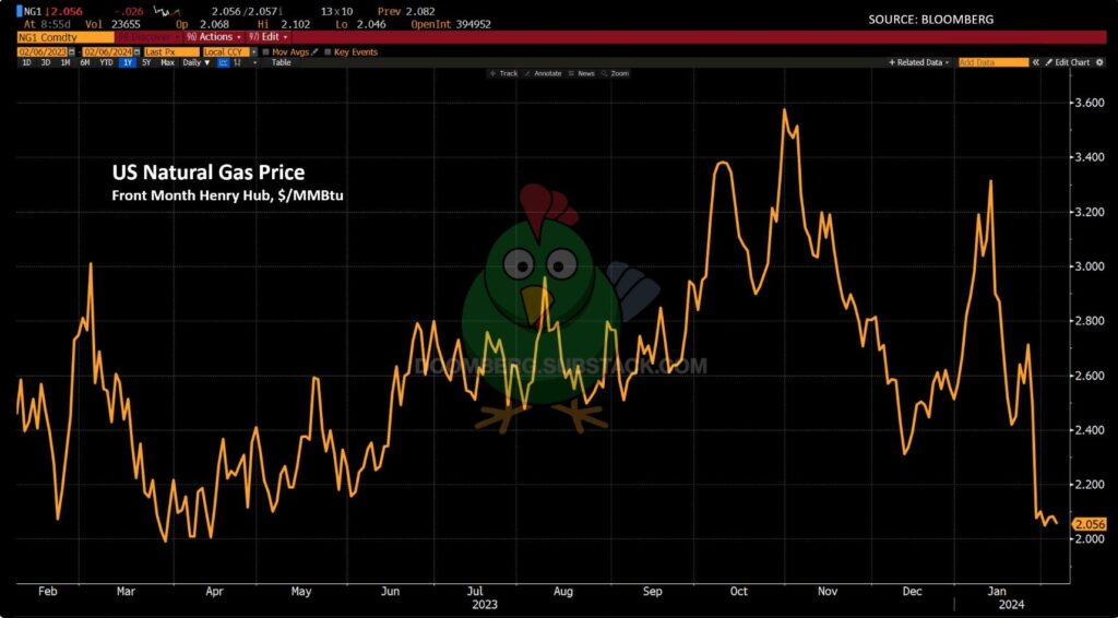 Figur 2. Priset på naturgas vid Henry Hub, USA, Bloomberg data