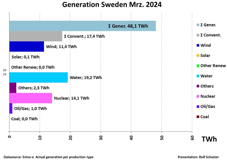 Vindkraften har minskat från 25,8 % i februari. Vattenkraften och kärnkraften har ökat 3,7 respektive 3,3 procentenheter.