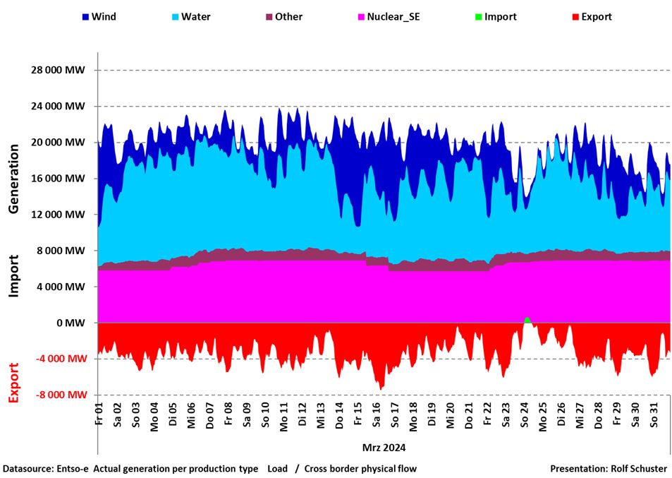 Vattenkraften dominerar praktiskt taget hela månaden. Den står också för större delen av den betydande exporten. Vi har alltså inte “energibrist” i Sverige, men allvarlig “effektbrist” vid vissa tillfällen.