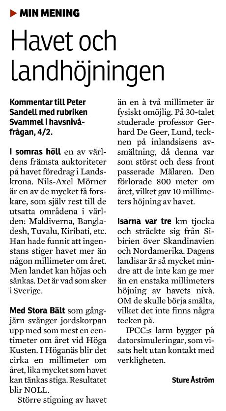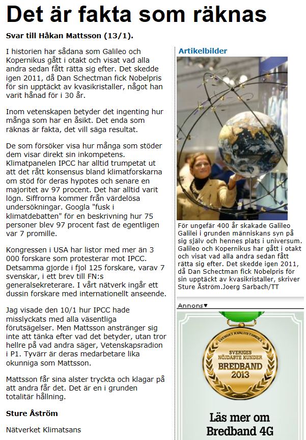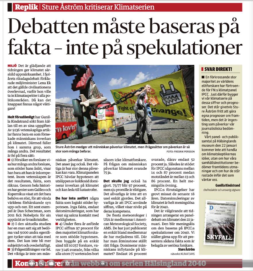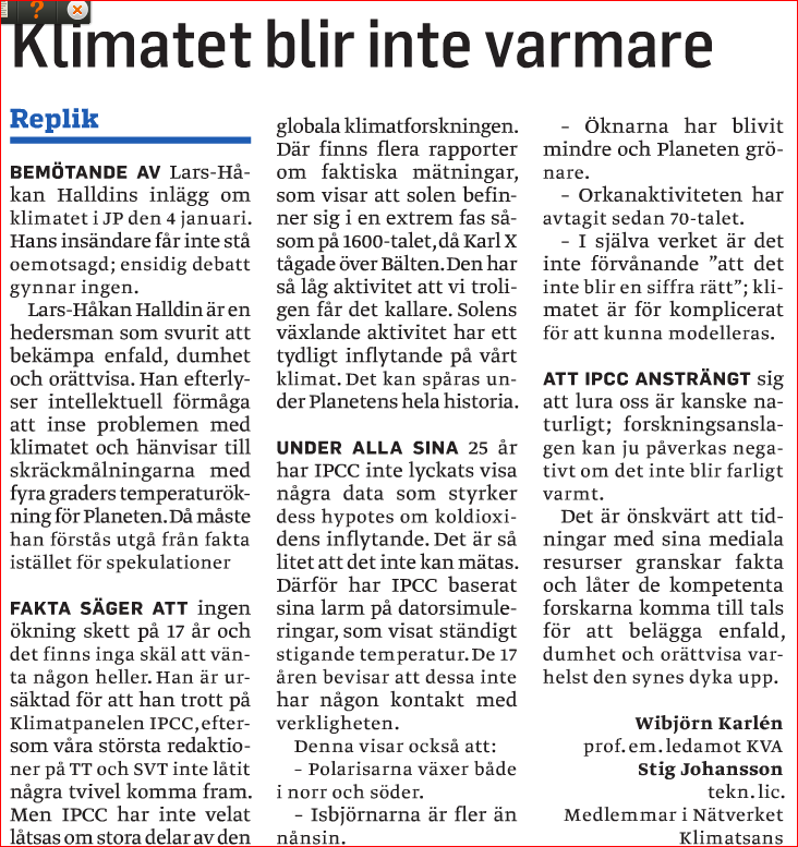 Jag väntar mig att en skärpt journalist av nyfikenhet skall söka fler fakta, när det gäller en så viktig fråga som klimatet. Gör inte läsarna det också? Jag berättar gärna mera.