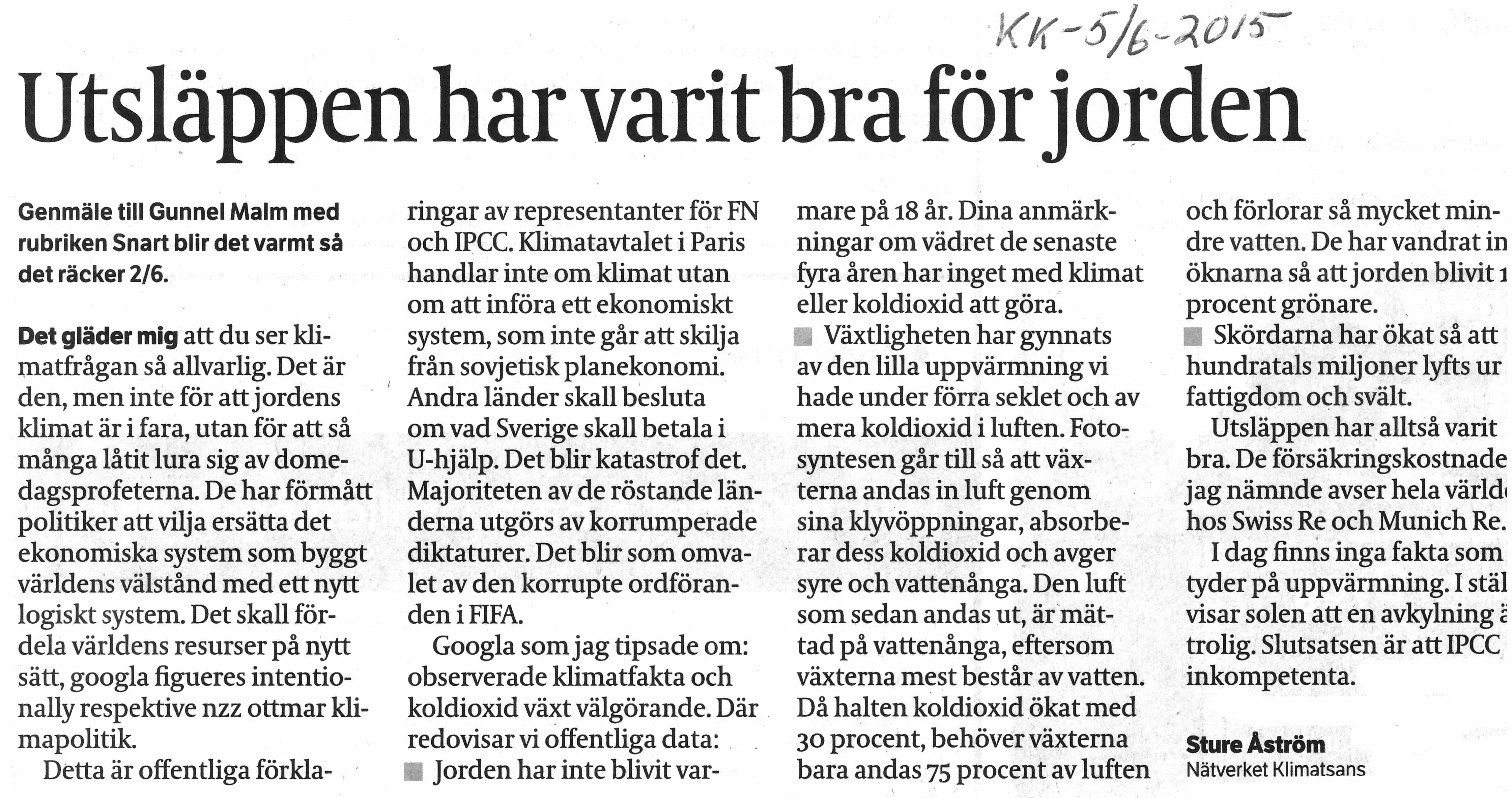 Låt mig vidare påminna om att koldioxid är växtlighetens livsnödvändiga näring, att jordens växtlighet de senaste 30 åren ökat med 11 procent och att jordens skördar sedan 1930 femfaldigats, medan folkmängden bara ökat 3,5 gånger. Fler har alltså fått det bättre!